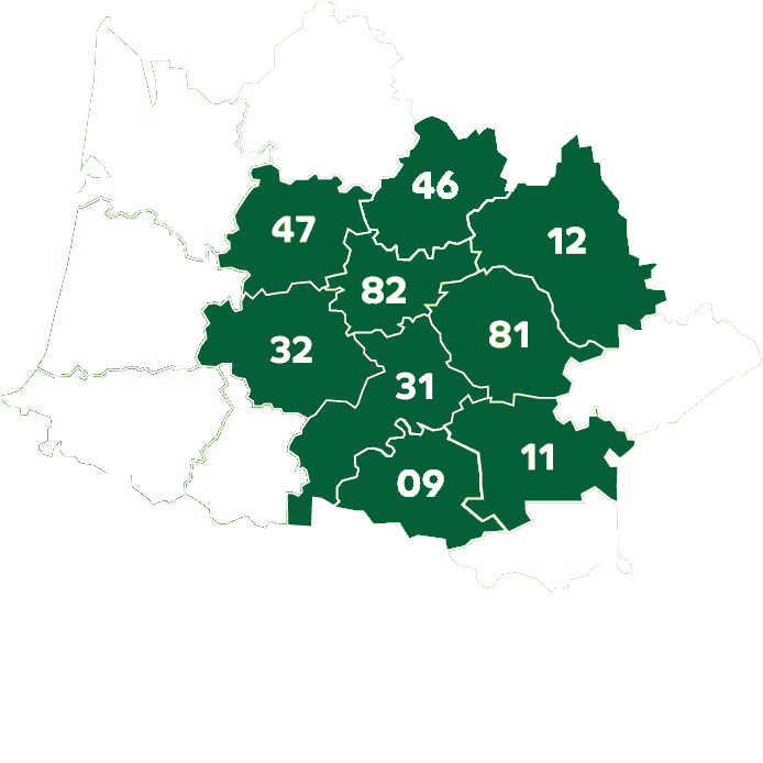 Nous accompagnons quotidiennement nos producteurs sur 9 départements clés : Ariège, Aude, Aveyron, Haute-Garonne, Gers, Lot, Lot-et-Garonne, Tarn, Tarn-et-Garonne